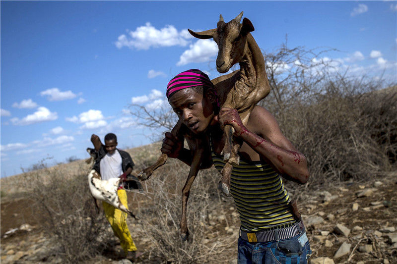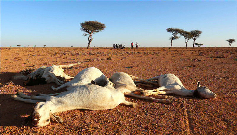 當?shù)貢r間2016年12月15日,索馬里邦特蘭,干旱的土地上散布著羊的尸體。當?shù)卦庥龈珊堤鞖猓笫艿轿:Α?/p>
