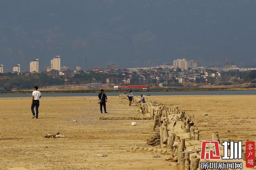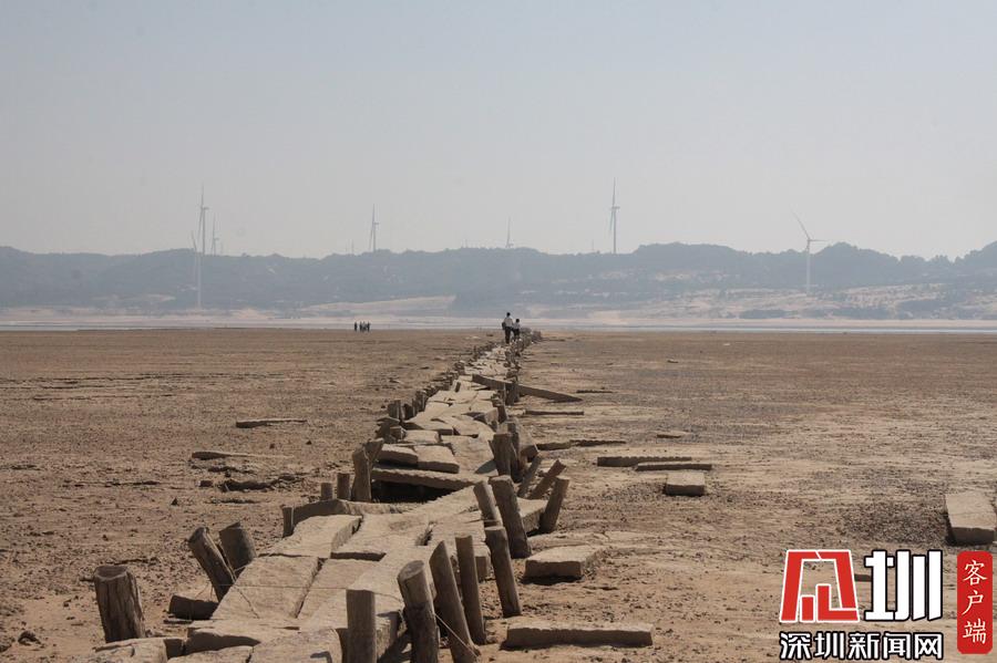 江西九江,隨著水位持續(xù)下降,豐水期浸泡在鄱陽湖底被譽為“中國最長的湖中古木石橋”露出水面。