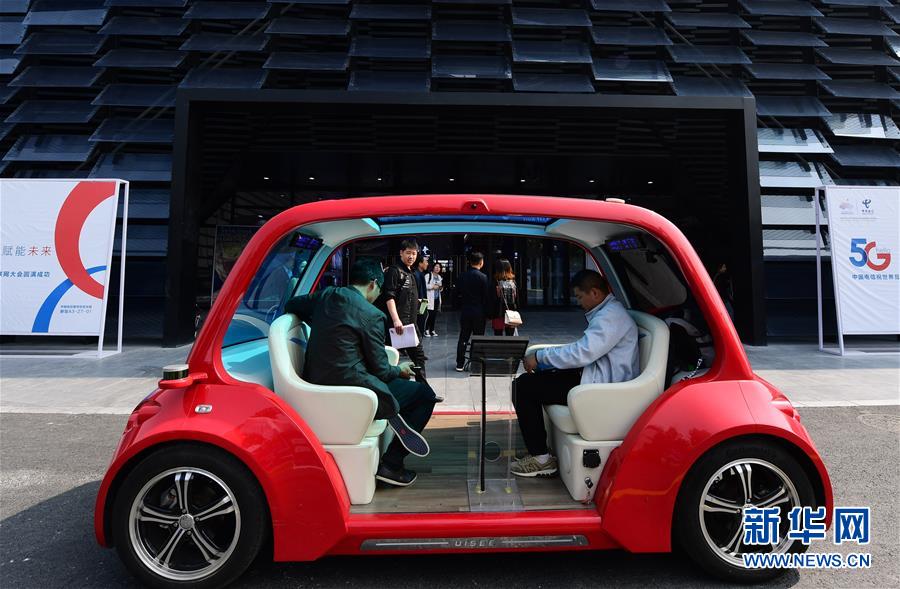 10月21日在浙江烏鎮(zhèn)舉行的互聯(lián)網(wǎng)之光博覽會(huì)會(huì)場(chǎng)外拍攝的5G無人駕駛體驗(yàn)車。新華社記者尹棟遜攝