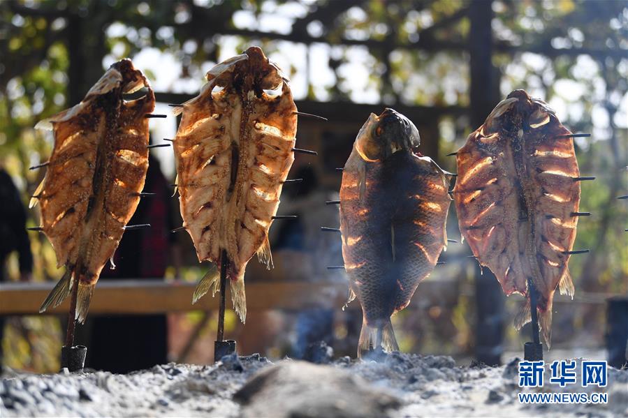 10月26日在新疆阿瓦提縣刀郎部落景區(qū)拍攝的烤魚。新華社記者沙達(dá)提攝