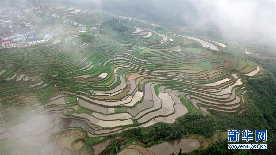 5月18日,農(nóng)民在貴州省丹寨縣龍泉鎮(zhèn)高要梯田里耕作(無人機拍攝)。初夏時節(jié),位于貴州省丹寨縣龍泉鎮(zhèn)的高要梯田景色優(yōu)美。新華社記者楊文斌攝