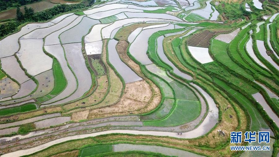5月18日,農民在貴州省丹寨縣龍泉鎮(zhèn)高要梯田里耕作(無人機拍攝)。初夏時節(jié),位于貴州省丹寨縣龍泉鎮(zhèn)的高要梯田景色優(yōu)美。新華社記者楊文斌攝