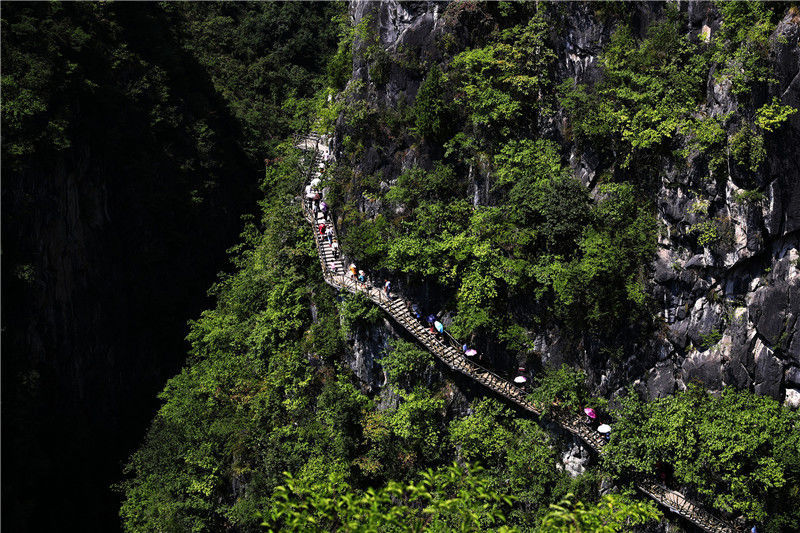 2019年9月13日,游客在重慶市黔江區(qū)城市峽谷景區(qū)芭拉胡的懸崖棧道上游玩。當天是中秋節(jié)假的第一天。楊敏/視覺中國編輯/陳進