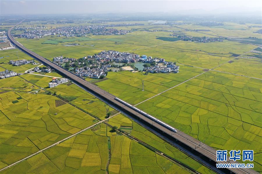 眼下,廣西賓陽縣古辣鎮(zhèn)大面積稻田進入收獲期,一列列南來北往的動車從稻田間飛馳而過,構(gòu)成一幅幅美麗的豐收圖畫。