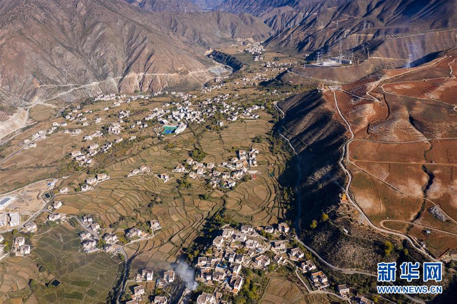 10月29日,俯瞰四川省鄉(xiāng)城縣的定曲河峽谷的青德鄉(xiāng),白色藏房點(diǎn)綴在田園之中(無人機(jī)拍攝)。新華社記者江宏景攝