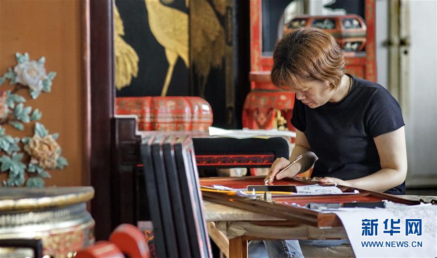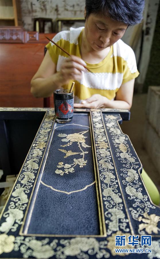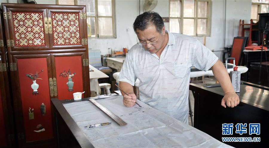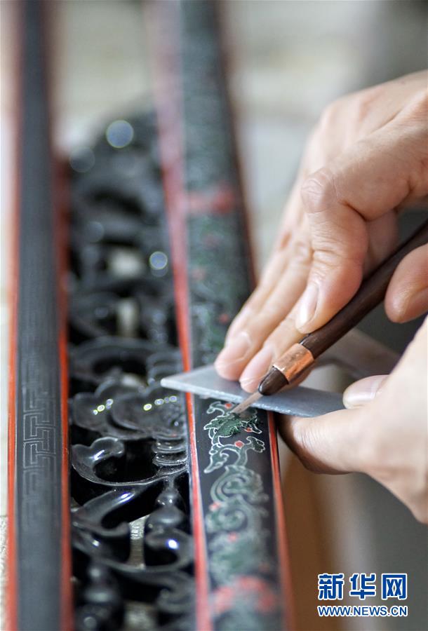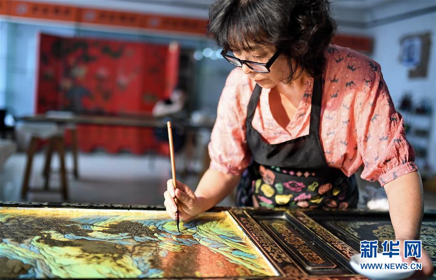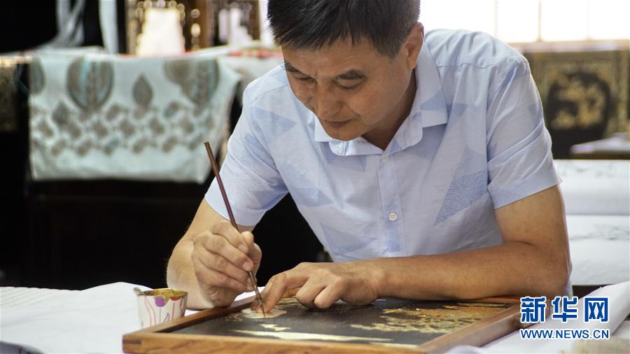 北京金漆鑲嵌有限責任公司工藝美術(shù)大師胡昕在創(chuàng)作漆畫屏風(9月19日攝)。新華社記者李欣攝