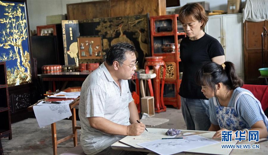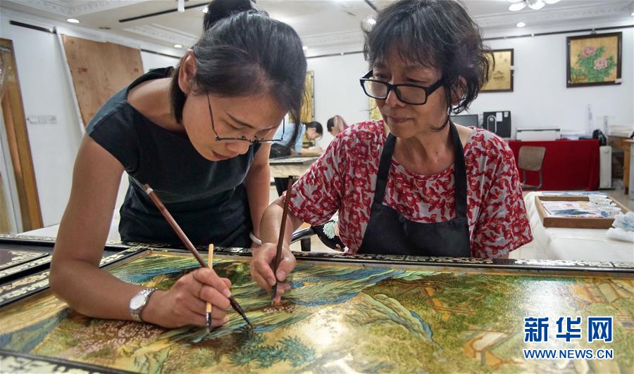 北京金漆鑲嵌有限責任公司工藝美術(shù)大師胡昕(右)在向?qū)W生傳授漆畫技藝(9月19日攝)。新華社記者李欣攝