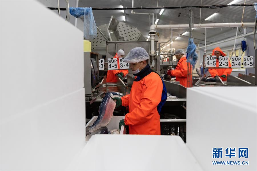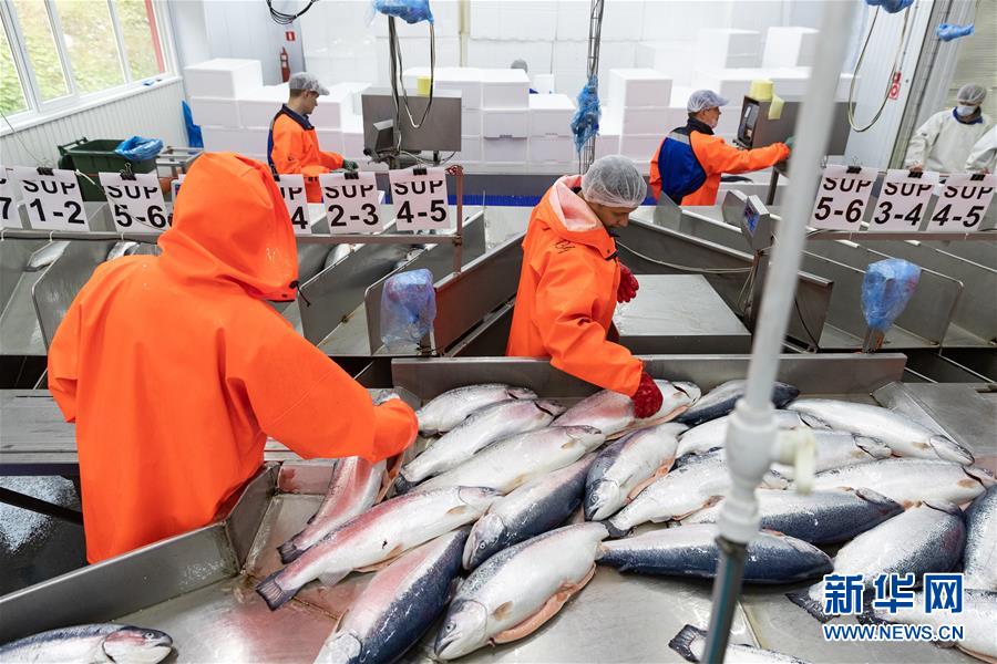 9月13日,在俄羅斯摩爾曼斯克,俄羅斯水產養(yǎng)殖公司工作人員在車間處理鮭魚。 新華社記者白雪騏攝