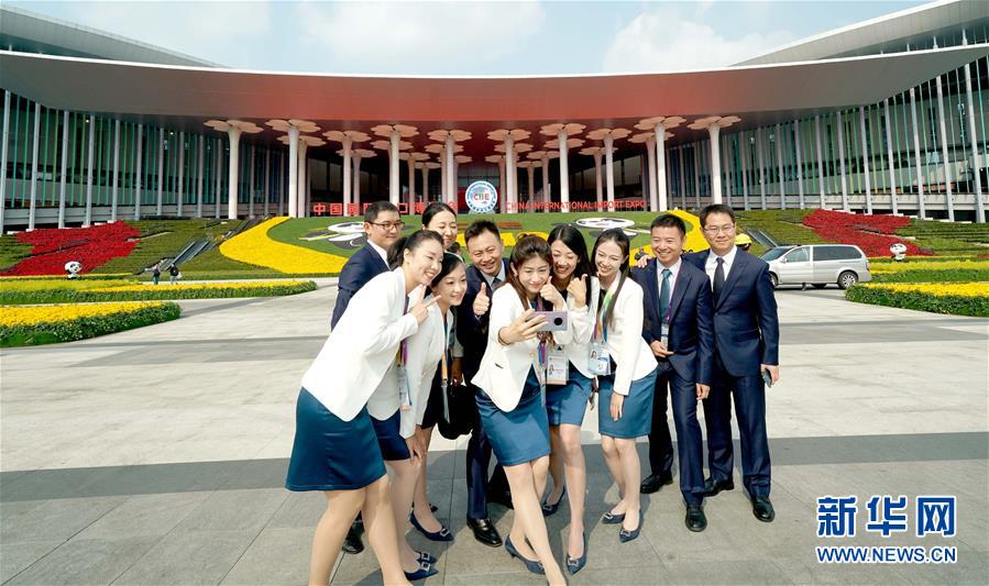11月4日,第二屆中國(guó)國(guó)際進(jìn)口博覽會(huì)中國(guó)館的工作人員在國(guó)家會(huì)展中心(上海)南廣場(chǎng)合影。新華社記者 陳建力 攝