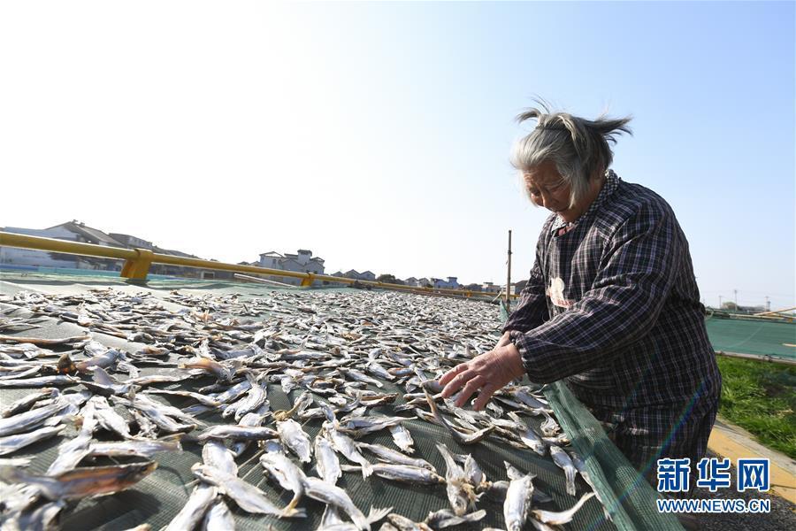 3月12日,浙江省湖州市吳興高新區(qū)幻溇村村民在翻動晾曬的魚干。近日,太湖南岸湖州地區(qū)久雨初晴,漁民忙著制作、晾曬魚干。新華社記者翁忻旸攝