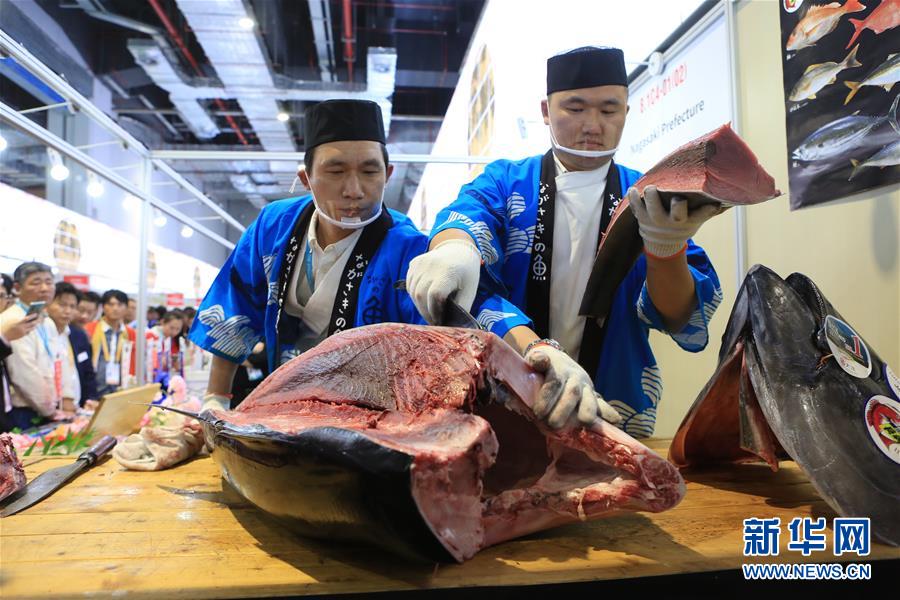 11月7日,來自日本長崎魚市株式會社的專業(yè)切魚師傅為解體70公斤藍(lán)鰭金槍魚做準(zhǔn)備。第二屆中國國際進(jìn)口博覽會正在上海國家會展中心舉行。博覽會的食品及農(nóng)產(chǎn)品展區(qū)里匯集了來自世界各地的美食,同時(shí)也上演各種精彩美食秀。11月7日,來自日本長崎魚市株式會社的專業(yè)切魚師傅現(xiàn)場解體一條70公斤的藍(lán)鰭金槍魚,吸引大量參觀者觀看、品嘗。新華社記者王鵬攝