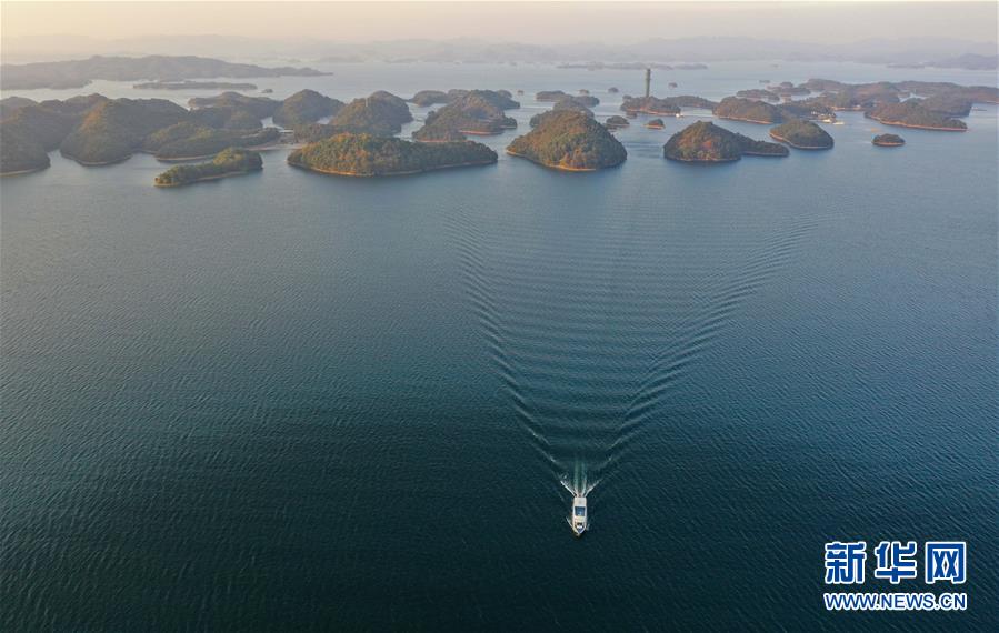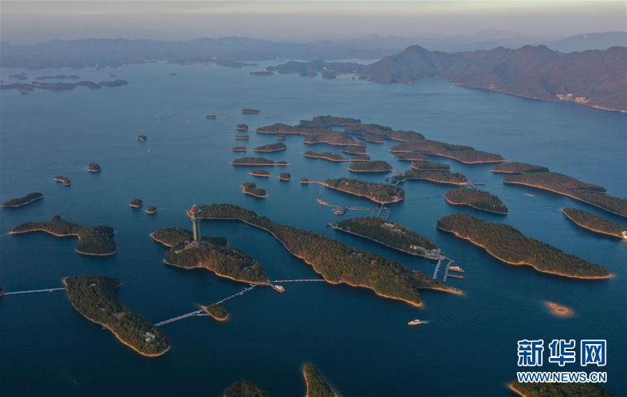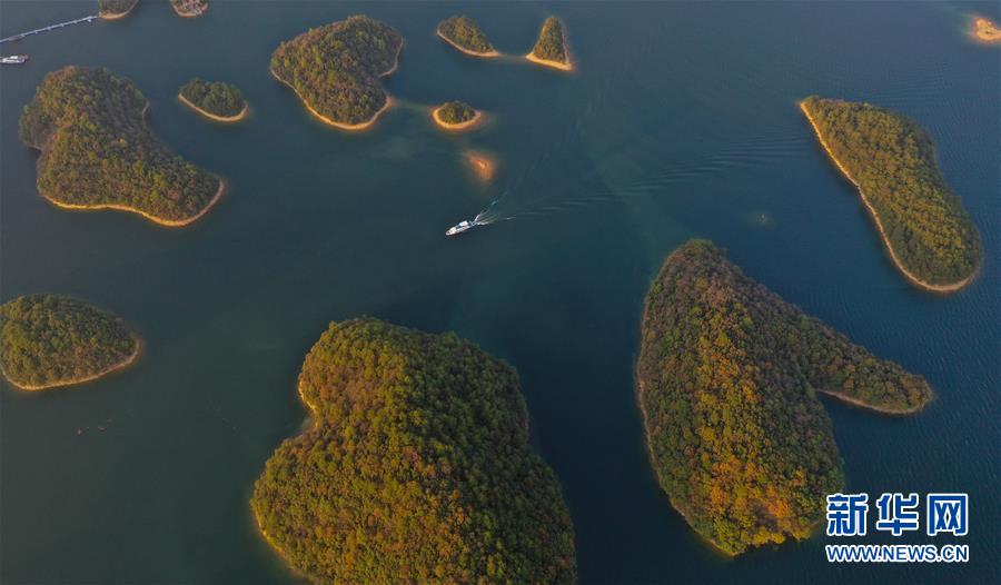 11月9日無人機拍攝的廬山西海。 當(dāng)日,落日余暉下的江西廬山西海山青水藍,美不勝收。 新華社記者 周密 攝