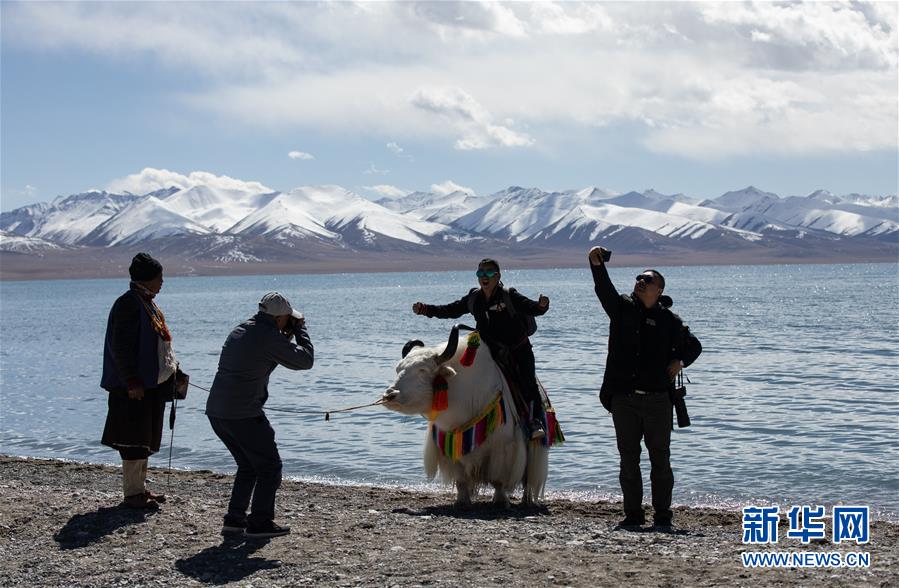 游人在西藏納木錯湖邊留影(10月28日攝)。新華社記者江宏景攝