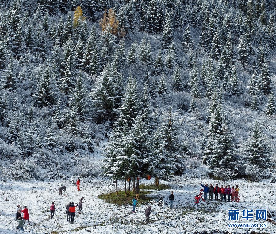 10月17日,在川藏線高爾寺山至理塘路段,部分游客在一個(gè)路邊觀景臺(tái)附近拍照留念。當(dāng)日,一場(chǎng)夜雪后,川藏線高爾寺山至理塘路段披上了一層銀裝。雪山、牦牛、云朵、松林,帶來了濃濃的雪域風(fēng)情。新華社記者王迪攝