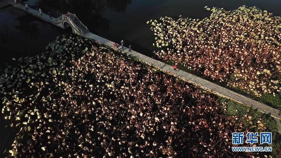 11月14日,游客在奇墅湖邊拍照(無人機(jī)拍攝)。新華社記者張端攝