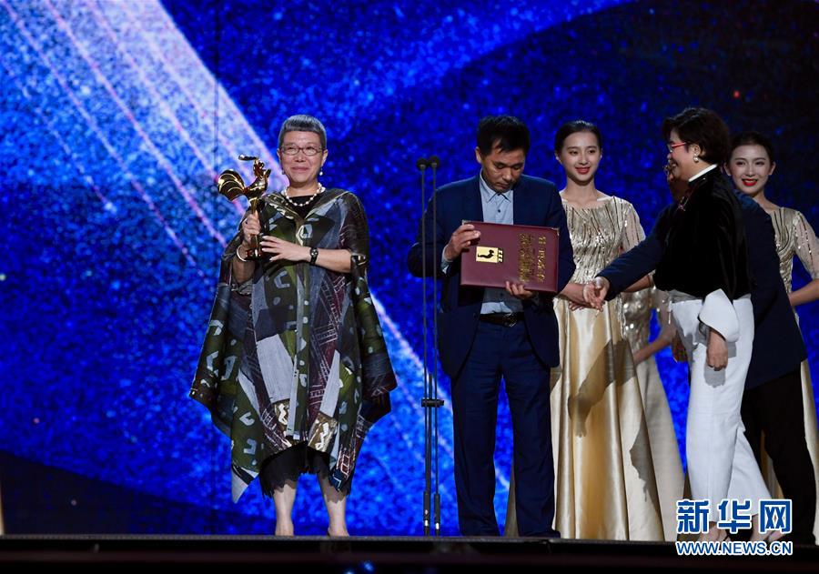 11月23日,最佳中小成本故事片獎獲獎電影《紅花綠葉》導演劉苗苗(左一)出席頒獎典禮。當日,第32屆中國電影金雞獎頒獎典禮在福建廈門舉行。新華社記者姜克紅攝