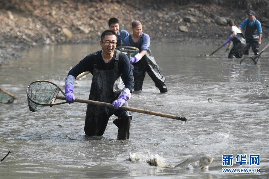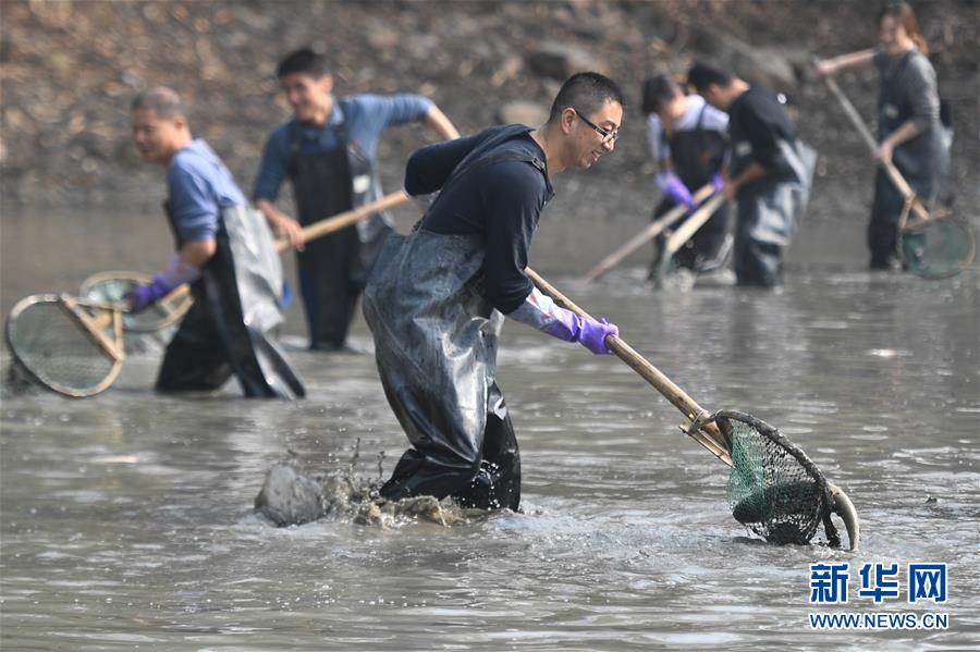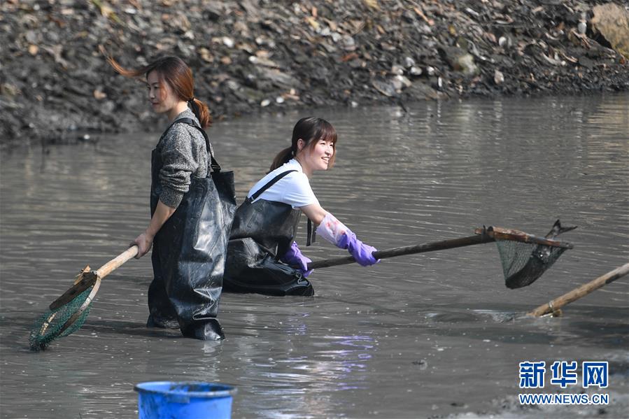 11月24日,游客在西溪濕地體驗(yàn)“干塘”捕魚。新華社記者黃宗治攝