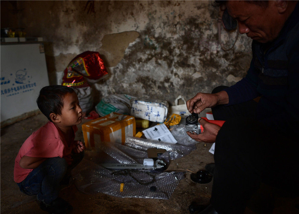 2019年11月16日,四川涼山,楊陽的父親某色蘇拉澤正在安裝電鋸。