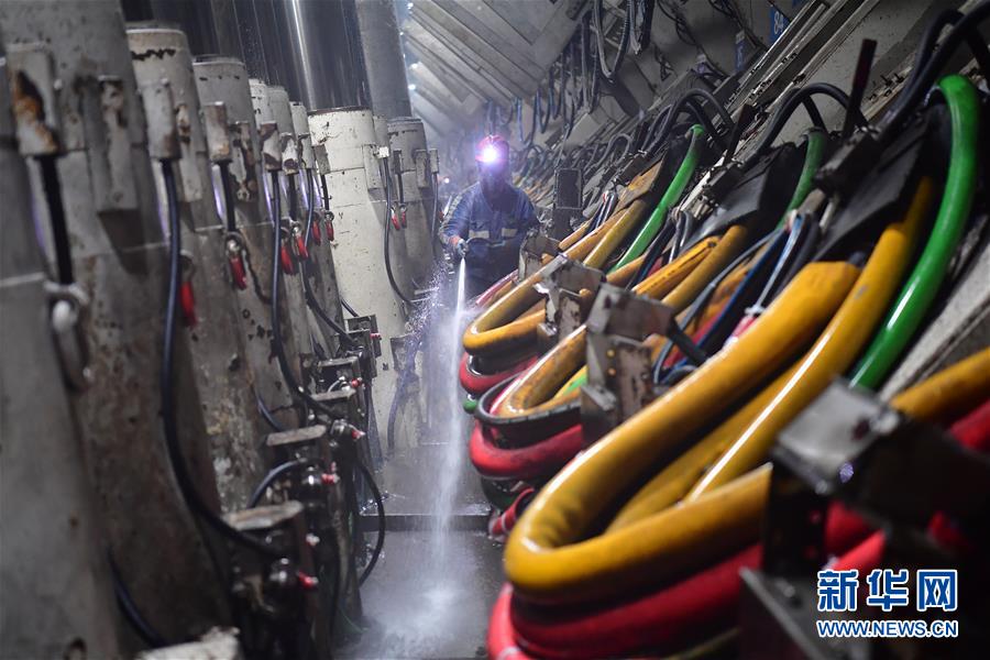 11月26日,在上灣煤礦12402綜采面內(nèi),工作人員對(duì)液壓支架區(qū)域進(jìn)行沖洗清潔。 新華社記者 邵瑞 攝