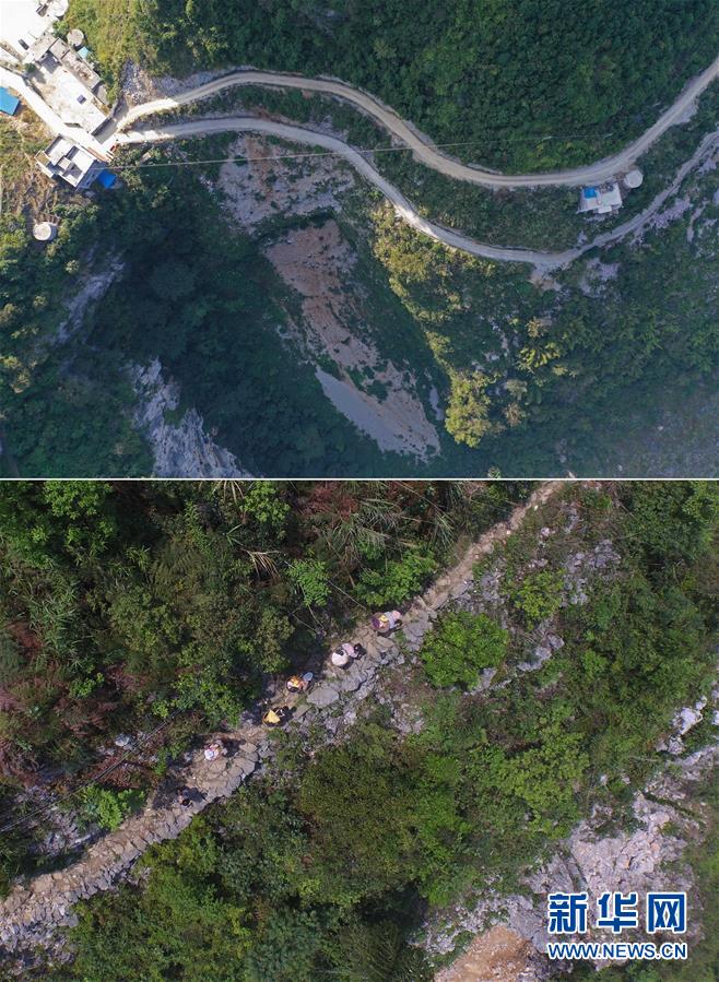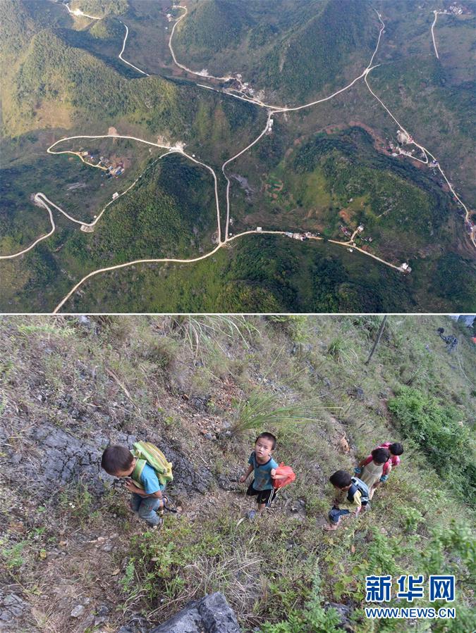 拼版照片:上圖為剛剛修通公路的大化瑤族自治縣板升鄉(xiāng)八好村弄麻屯(11月11日無人機拍攝);下圖為在尚未通路的八好村弄麻屯,孩子們爬山路回家(2016年9月23日攝)。新華社記者黃孝邦攝