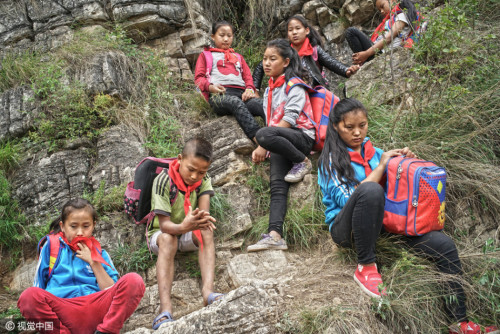 上學(xué)的孩子都背著沉沉的書包,大多數(shù)是女孩,15個孩子在三個家長的保護下,大約用了2個小時,到達(dá)“懸崖村”。上山容易下山難,遇到雨雪天氣,村里人就不再外出了。圖片來源:視覺中國