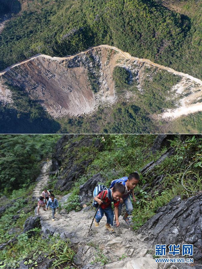 拼版照片:上圖為大化瑤族自治縣七百弄鄉(xiāng)弄良村弄丘屯剛剛修通的公路(右下段)和村道、鄉(xiāng)道連接(11月12日無人機拍攝);下圖為在尚未通路的弄良村弄丘屯,孩子們爬“天梯”回家(2016年12月9日攝)。新華社記者黃孝邦攝