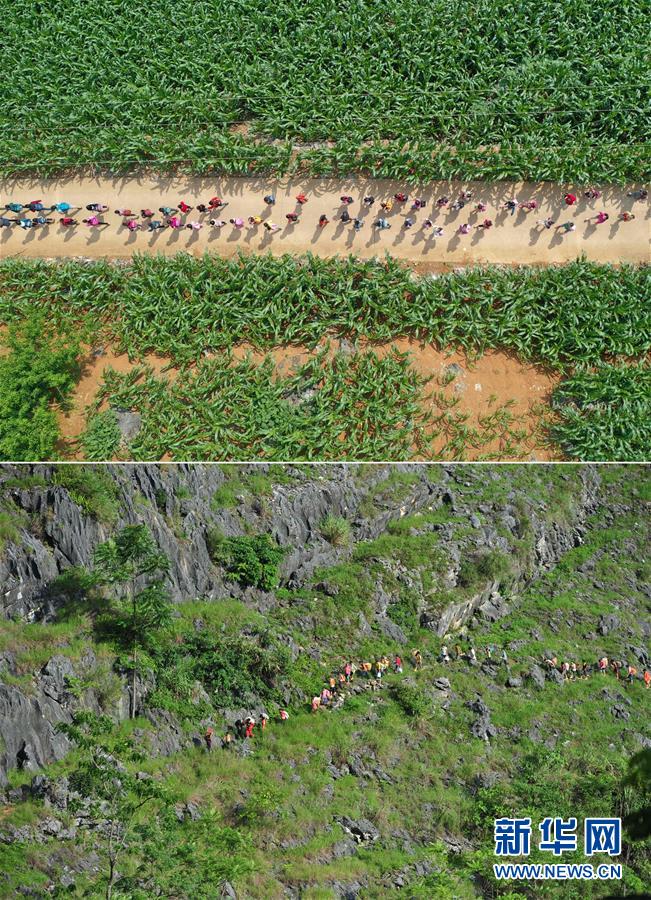拼版照片:上圖為在大化瑤族自治縣板升鄉(xiāng)弄勇村,孩子們走在放學(xué)路上(5月10日無人機拍攝);下圖為在弄勇村弄頂屯,孩子們扛著生活用具,走山路回家(2012年7月4日攝)。新華社記者黃孝邦攝