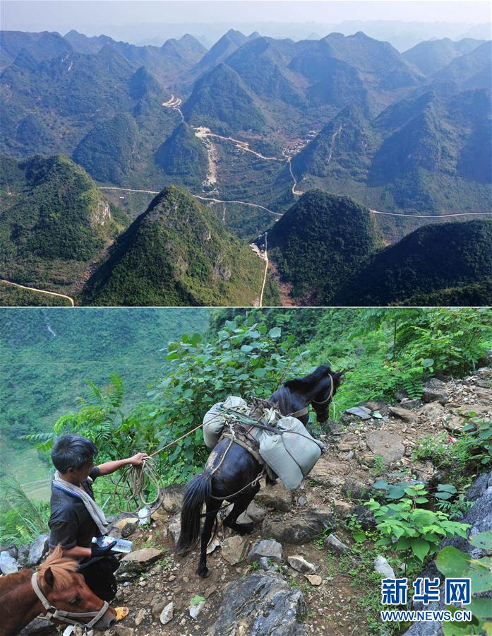 拼版照片:上圖為已經(jīng)修通水泥路的大化瑤族自治縣板升鄉(xiāng)八好村八好屯(11月11日無人機拍攝);下圖為在尚未通路的八好村八好屯,村民背著年貨走山路回家(2016年1月26日攝)。新華社記者黃孝邦攝