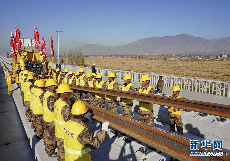 11月1日,在京張高鐵河北懷來段鋪軌現(xiàn)場,中鐵三局的工人正在鋪設(shè)京張高鐵全線第一節(jié)軌排。
