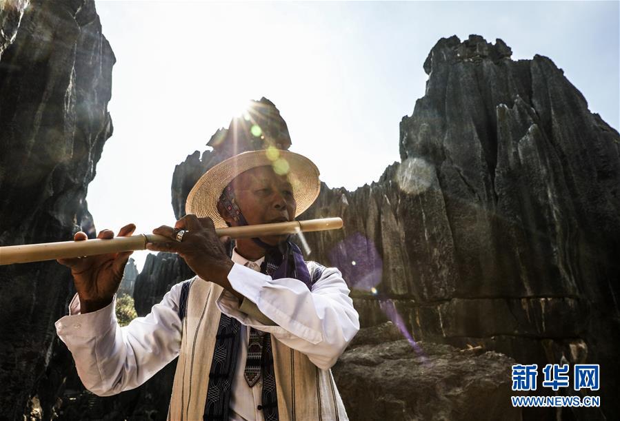當地少數民族樂手在石林景區(qū)演奏民族音樂(11月27日攝)。新華社記者蘭紅光攝