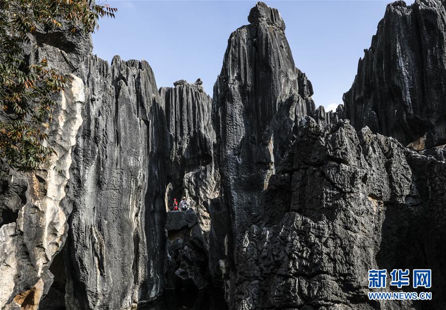 當(dāng)?shù)厣贁?shù)民族樂手在石林景區(qū)演奏民族音樂(11月27日攝)。新華社記者蘭紅光攝