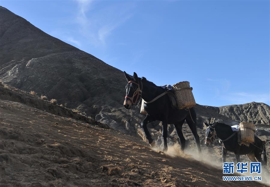 12月6日,向山頂塔基施工現(xiàn)場馱負工程物料的騾馬隊在夕陽下卸貨歸來。新華社記者侯捷攝