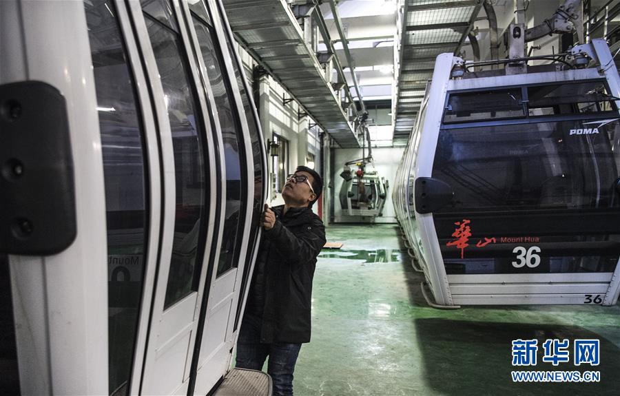 華山太華索道檢修人員在檢查吊廂門開關(guān)(12月6日攝)。新華社記者陶明攝