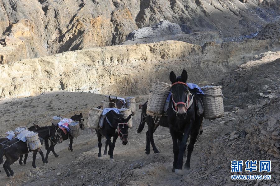 12月6日,騾馬隊馱負工程物料前往山頂塔基施工現(xiàn)場。新華社記者李楨宇攝