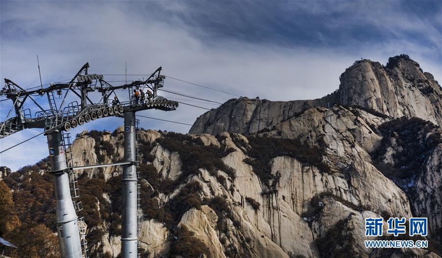 華山太華索道維修人員在進行索道支架橫擔檢測(12月5日無人機拍攝)。新華社記者陶明攝