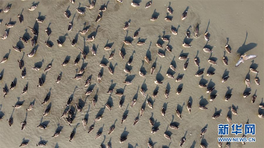 12月7日,一群候鳥在升金湖停留(無人機(jī)拍攝)。新華社記者張端攝