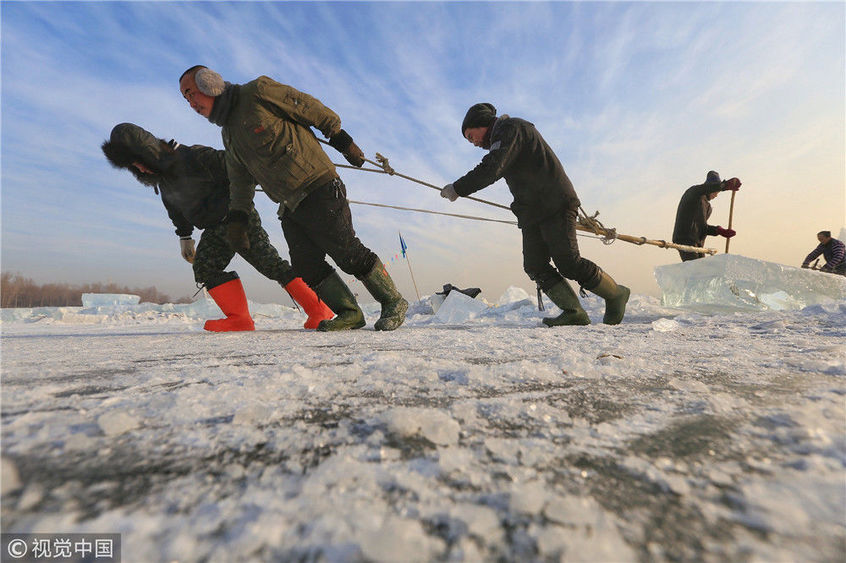 2018年12月11日,黑龍江省哈爾濱市,松花江上,采冰者們彎腰拉繩,宛如纖夫般拽重達半噸的冰塊出水。采冰者都是自哈市江北萬寶、東發(fā)、沙陀子等鄉(xiāng)鎮(zhèn)的農(nóng)民,他們每年冬閑時都會親屬、村鄰之間結(jié)伴到松花江畔采冰,有的采冰人,已經(jīng)連續(xù)干了二十多年。每個采冰季,他們每天要在冰面上工作10-12個小時,每個采冰組,一天要拽出冰塊2000-3000塊,一個近20天的采冰季,每人能收入近萬元。