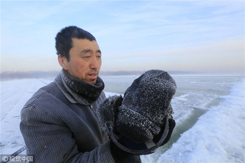 2018年12月11日,黑龍江省哈爾濱市,松花江上,采冰者們彎腰拉繩,宛如纖夫般拽重達(dá)半噸的冰塊出水。采冰者都是自哈市江北萬寶、東發(fā)、沙陀子等鄉(xiāng)鎮(zhèn)的農(nóng)民,他們每年冬閑時(shí)都會(huì)親屬、村鄰之間結(jié)伴到松花江畔采冰,有的采冰人,已經(jīng)連續(xù)干了二十多年。每個(gè)采冰季,他們每天要在冰面上工作10-12個(gè)小時(shí),每個(gè)采冰組,一天要拽出冰塊2000-3000塊,一個(gè)近20天的采冰季,每人能收入近萬元。
