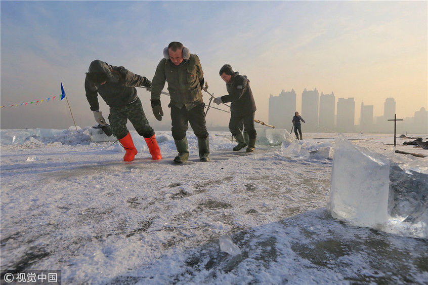 2018年12月11日,黑龍江省哈爾濱市,松花江上,采冰者們彎腰拉繩,宛如纖夫般拽重達(dá)半噸的冰塊出水。采冰者都是自哈市江北萬寶、東發(fā)、沙陀子等鄉(xiāng)鎮(zhèn)的農(nóng)民,他們每年冬閑時(shí)都會(huì)親屬、村鄰之間結(jié)伴到松花江畔采冰,有的采冰人,已經(jīng)連續(xù)干了二十多年。每個(gè)采冰季,他們每天要在冰面上工作10-12個(gè)小時(shí),每個(gè)采冰組,一天要拽出冰塊2000-3000塊,一個(gè)近20天的采冰季,每人能收入近萬元。