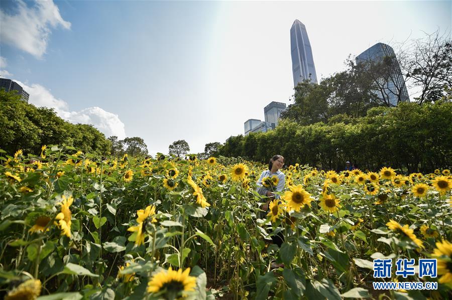游客在位于深圳市中心的向日葵園里游玩(2018年3月12日攝)。 新華社記者 毛思倩 攝