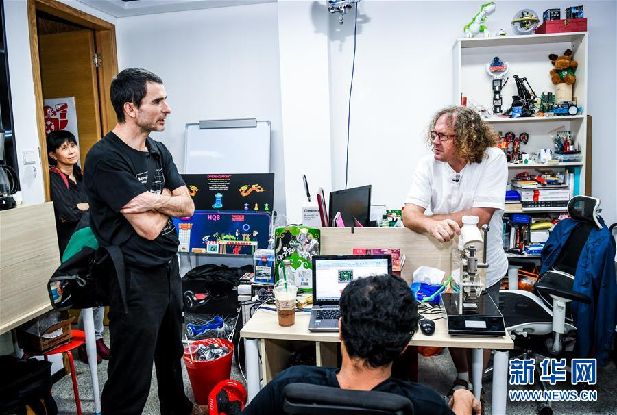 在深圳市福田區(qū)華強北一個創(chuàng)客孵化器內,來自荷蘭阿姆斯特丹的衛(wèi)國(右一)與來自不同國家的創(chuàng)客交流(2018年10月25日攝)。 新華社記者 毛思倩 攝