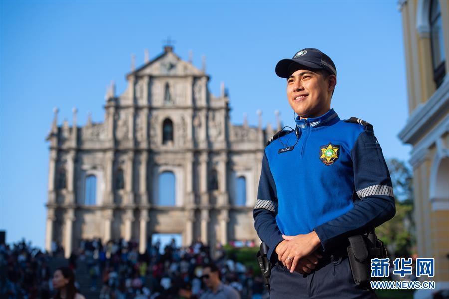 11月28日,澳門治安警察局旅游警察關(guān)天恒在大三巴牌坊附近巡邏,他已經(jīng)工作了2年,主要負責(zé)維持社會治安及解答游客問題。 新華社記者 張金加 攝