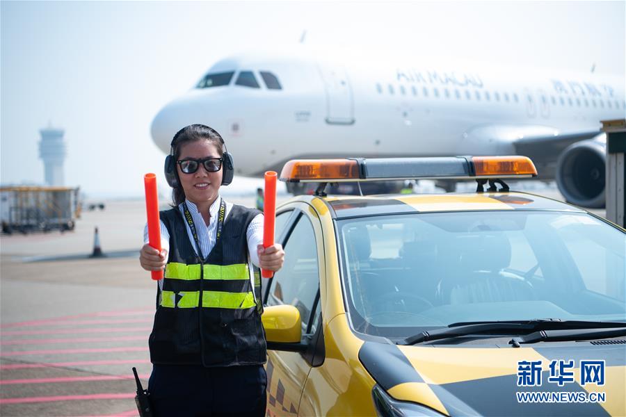 11月25日,澳門國(guó)際機(jī)場(chǎng)營(yíng)運(yùn)員鄧祺君在機(jī)場(chǎng)指揮飛機(jī)停泊,她已經(jīng)工作了3年。 新華社記者 張金加 攝