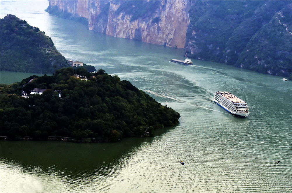 2019年11月3日,重慶,四面環(huán)水的“白帝城孤島”風(fēng)貌,各種豪華游輪陸續(xù)駛往寶塔坪旅游碼頭,供游客們登島參觀。