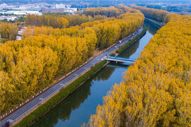 2019年11月03日,北京,京密引水渠昌平段,河道兩旁的楊樹葉已經(jīng)變黃,碧水黃葉映襯,秋意正濃。