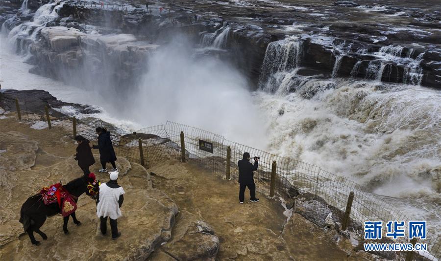 12月14日,游人在壺口瀑布景區(qū)游玩(無人機拍攝)。 新華社記者 陶明 攝