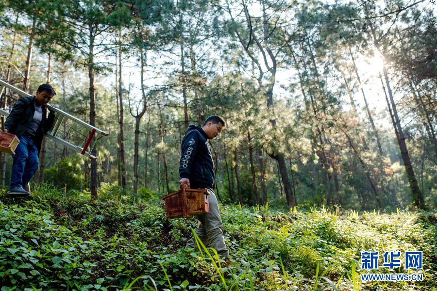 羅康(右)和同事準(zhǔn)備在哀牢山的松樹林里安裝人工鳥巢(12月12日攝)。 新華社記者 胡超 攝