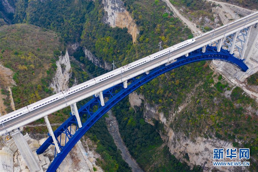 12月2日,一輛試驗列車駛過成貴高鐵西溪河大橋(無人機拍攝)。新華社記者劉續(xù)攝