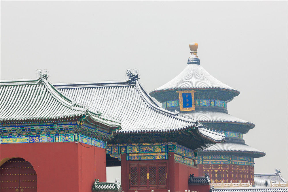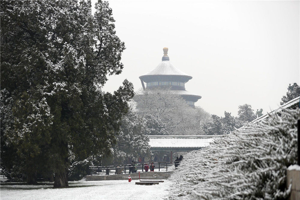 2019年11月30日,北京,初雪過(guò)后,天壇公園銀裝素裹,白雪古建相互映襯,景色迷人。時(shí)永平/千龍圖像/視覺中國(guó)