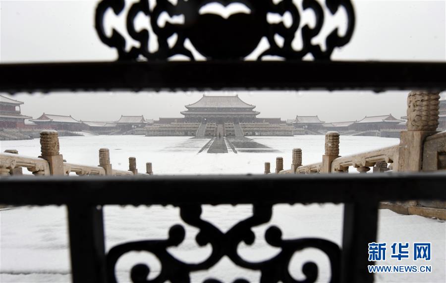 12月16日拍攝的雪中的故宮太和殿廣場(chǎng)。當(dāng)日,北京迎來(lái)降雪天氣。新華社記者金良快攝